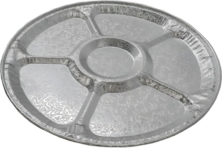 The 18″ diameter embossed aluminum serving tray with a full curl rim is a versatile catering accessory designed for various events. This tray features an ornate design and is divided into six compartments, making it perfect for serving and organizing different types of food. Made from lightweight aluminum, this disposable tray can be easily placed on a lazy Susan turntable (sold separately) at parties or receptions, allowing for easy access and serving of food. Aluminum is known for its ability to support both hot and cold foods, and it can be recycled after use, making it an environmentally friendly choice.